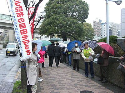 国民救援会主催の最高裁前宣伝・要請行動が3月24日(月)8時15分より行われました。あいにくの小雨模様でしたが最高裁判所で闘っている12団体60名の人が共同・協力し、1時間ビラを配布、9団体の代表がマイクで訴えました。