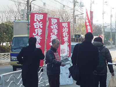 新年を迎え、1月19日にこれまでの運動スタイルを変えて、明治乳業本社前において朝の8時半から9時半、みずほ銀行京橋支店前10時半から11時半、明治HD前を11時50分から12時55分までの宣伝を元気よくスターとさせました。