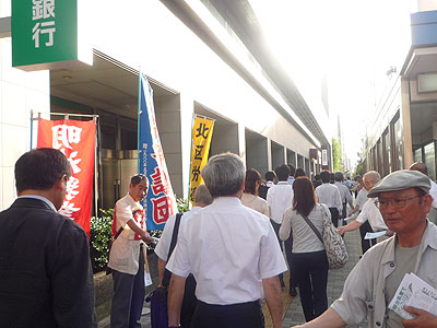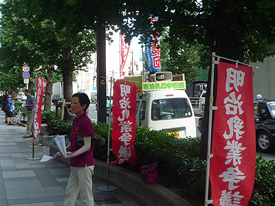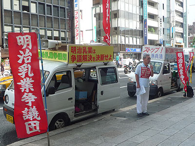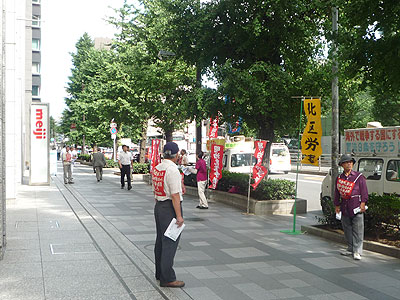 6月29日に開かれた明治ホールディングス株主総会の内容を知らせる宣伝を7月14日の午後2時から、みずほ銀行京橋支店〜明治HD〜メトロ東西線東陽町駅の3ヶ所で6時まで行いました。