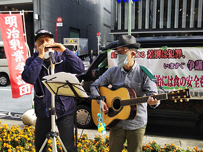 明治乳業争議の解決を求めて明治HDと株式会社明治に対し毎月行動をしています。先ほども話しがありましたが隣の明治屋さんとは関係なくご迷惑をお掛けしています。