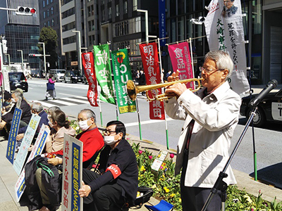 春の陽射しをタップリ仰ぎ見る中での第75次座り込み行動を継続しました。今回のライブは、何度か駆けつけていただいていますトランペット片手に全国を駆け巡り、文化活動の先頭に立っています松平晃さんにタップリ吹奏していただきました。