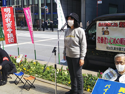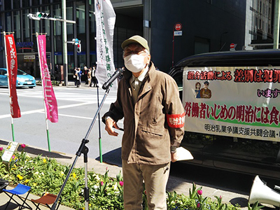 明治乳業争議小関団長から、市川工場が閉鎖されこの工場で3年間働きながらの争議の闘いがあった思い、この間、争議の解決条件がいくどもありながら解決を拒んできた明治の姿勢を報告。乳業メーカーが発展してきた大本にある酪農家が飼料の高騰、乳価の据え置きなどで危機に瀕している現状を報告し、明治がた溜め込んでいる5800億円に及ぶ内部留保をあてがい救済することが、明治に最も求められている姿勢であることを告発しました。