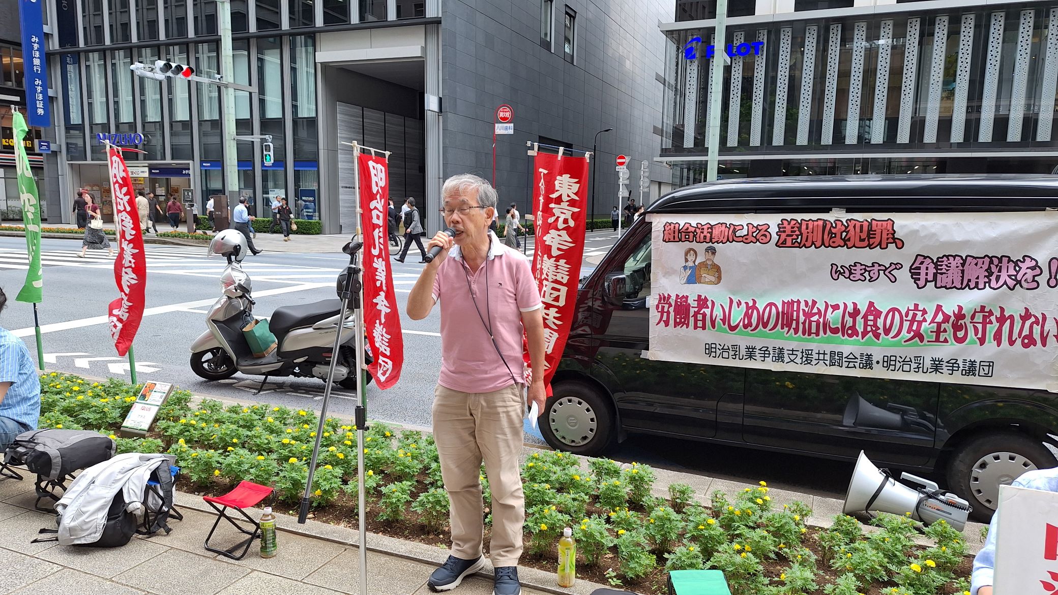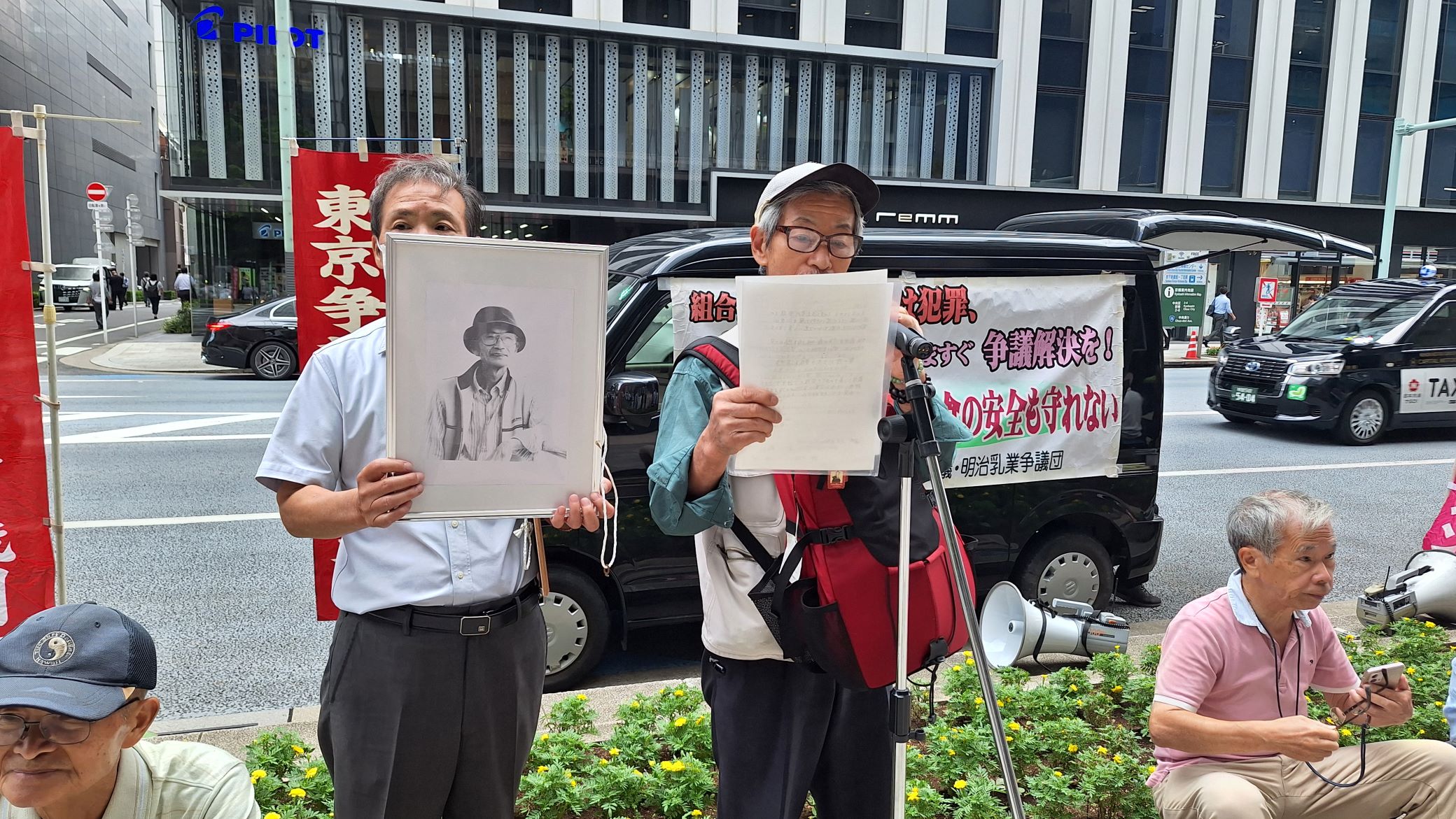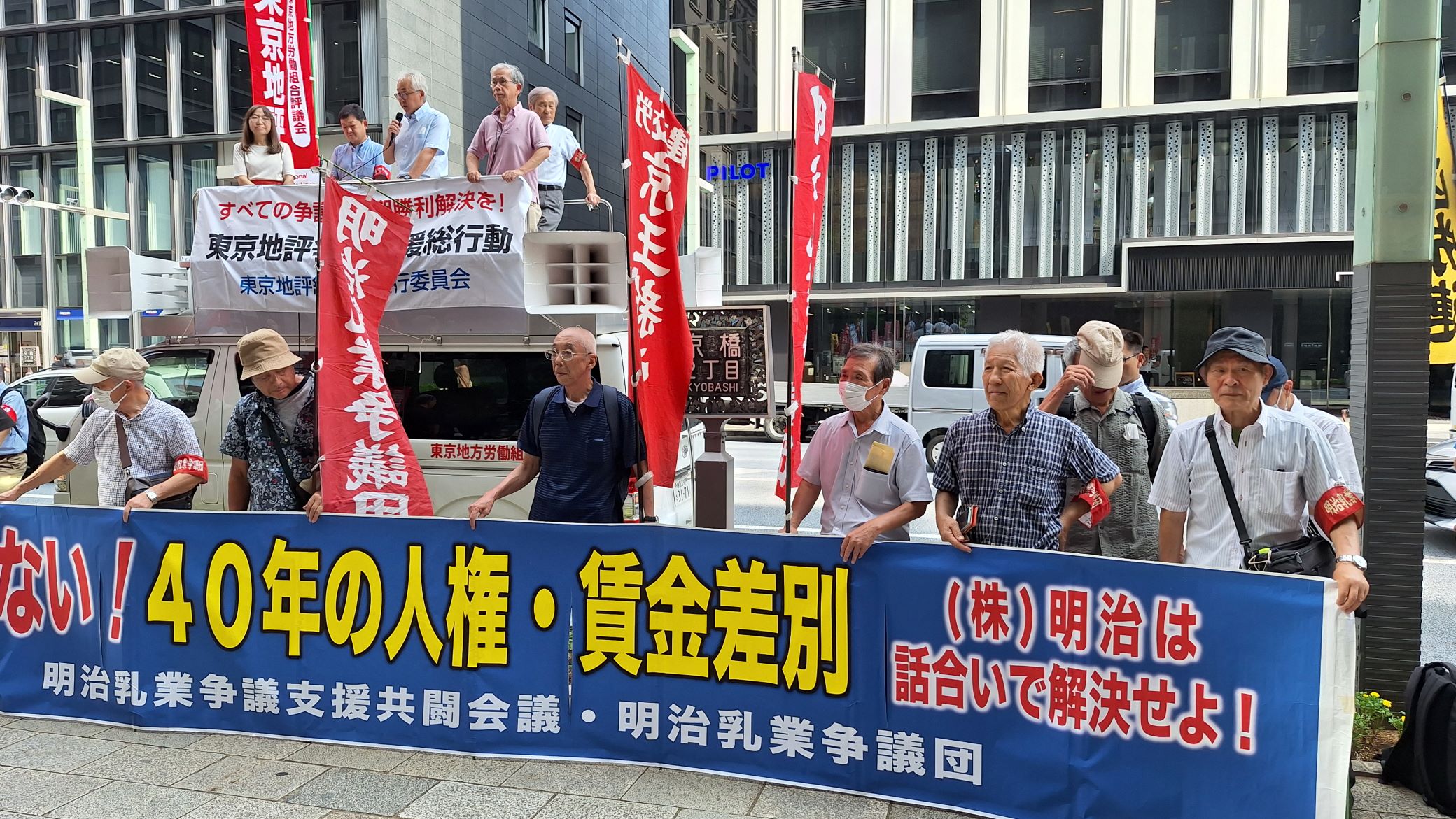 明治乳業争議団・明治乳業争議支援共闘会議は、この行動にエントリーし株式会社明治・松田克也社長(京橋エドグラン前)に対し、争議解決を頑なに、背を向けたままの経営姿勢に抗議と要請をおこないました。