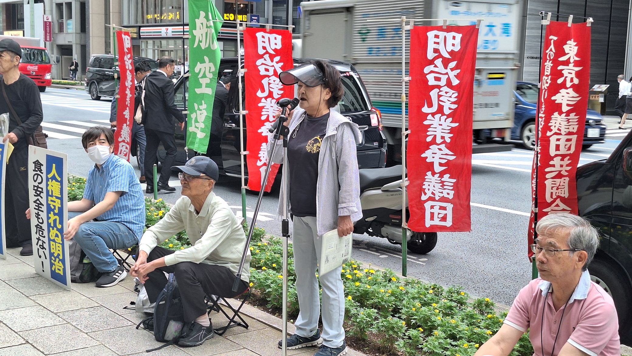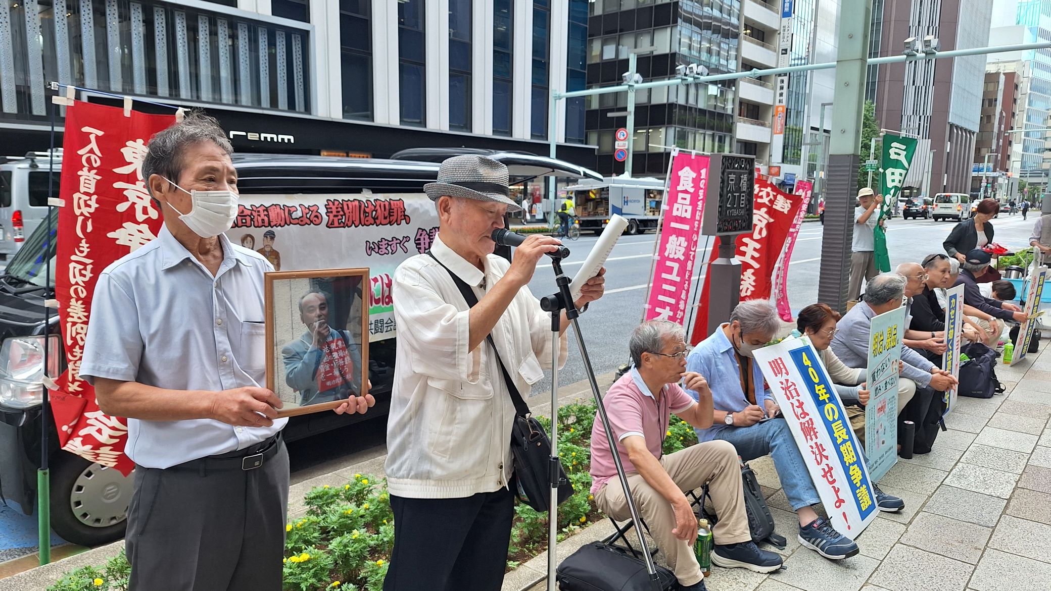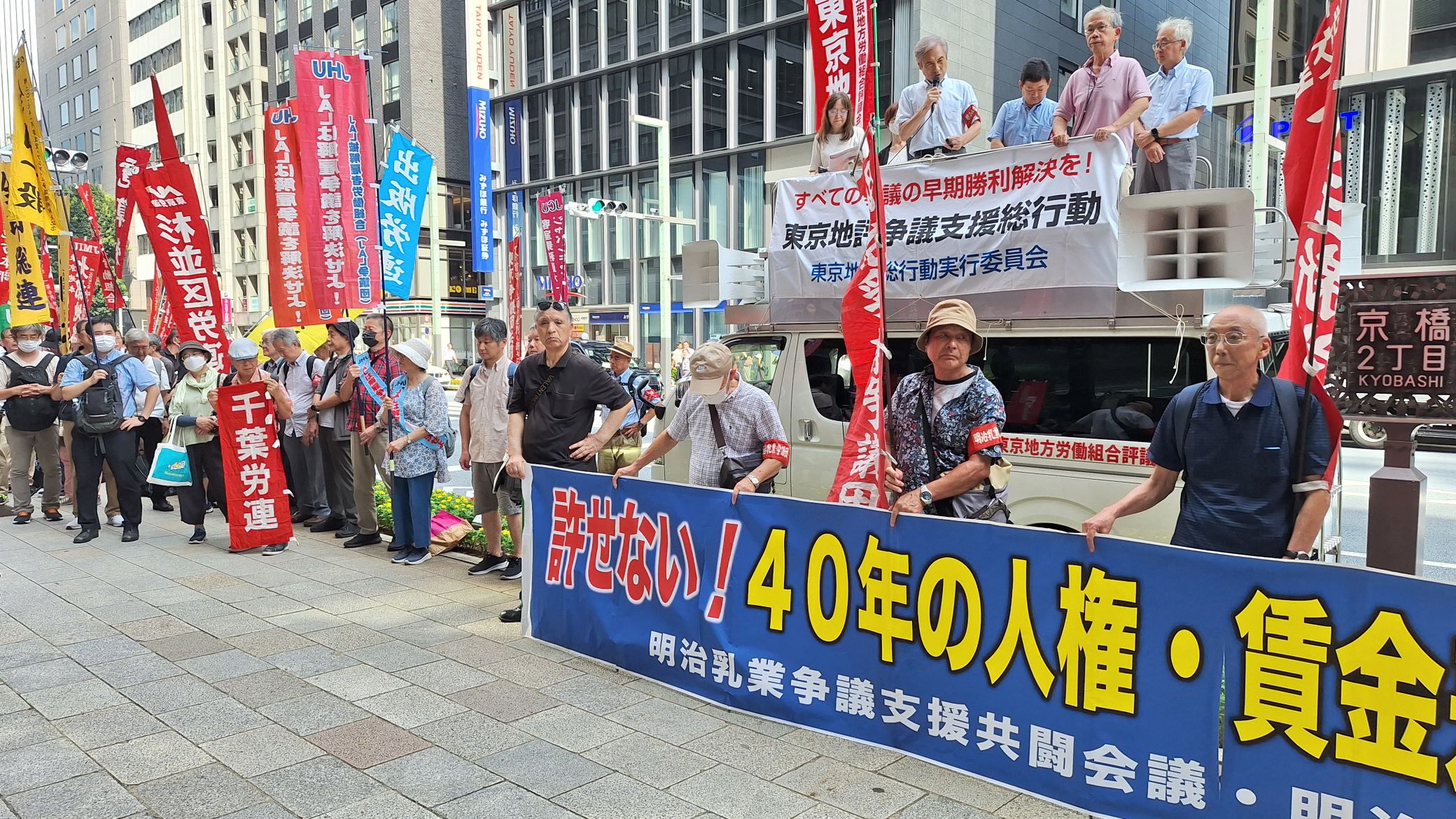 明治乳業争議団・明治乳業争議支援共闘会議は、この行動にエントリーし株式会社明治・松田克也社長(京橋エドグラン前)に対し、争議解決を頑なに、背を向けたままの経営姿勢に抗議と要請をおこないました。