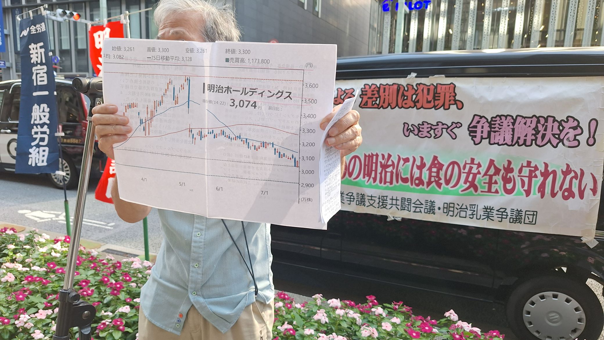 先ず、衝撃の情報です。日経の株価をご覧なりましたか、4万2千円。過去最高に迫る。ところが見て下さい。明治HDの株価3千円ギリギリ、3千円を割るのではないか。2016年以来右肩下がり。一方、日経平均右肩上がりで対極です。皆さん、なぜ明治HDの株価は下がり続けるのでしょうか。9つの金融機関が株を売却するという事態になりました。その背景に、40年にわたる明治乳業賃金差別、人権侵害の争議を解決しない異常な企業体質に対し、株主が反応していることです。株主からこの争議を終わらして株価を上げてほしい悲鳴が上がっています。