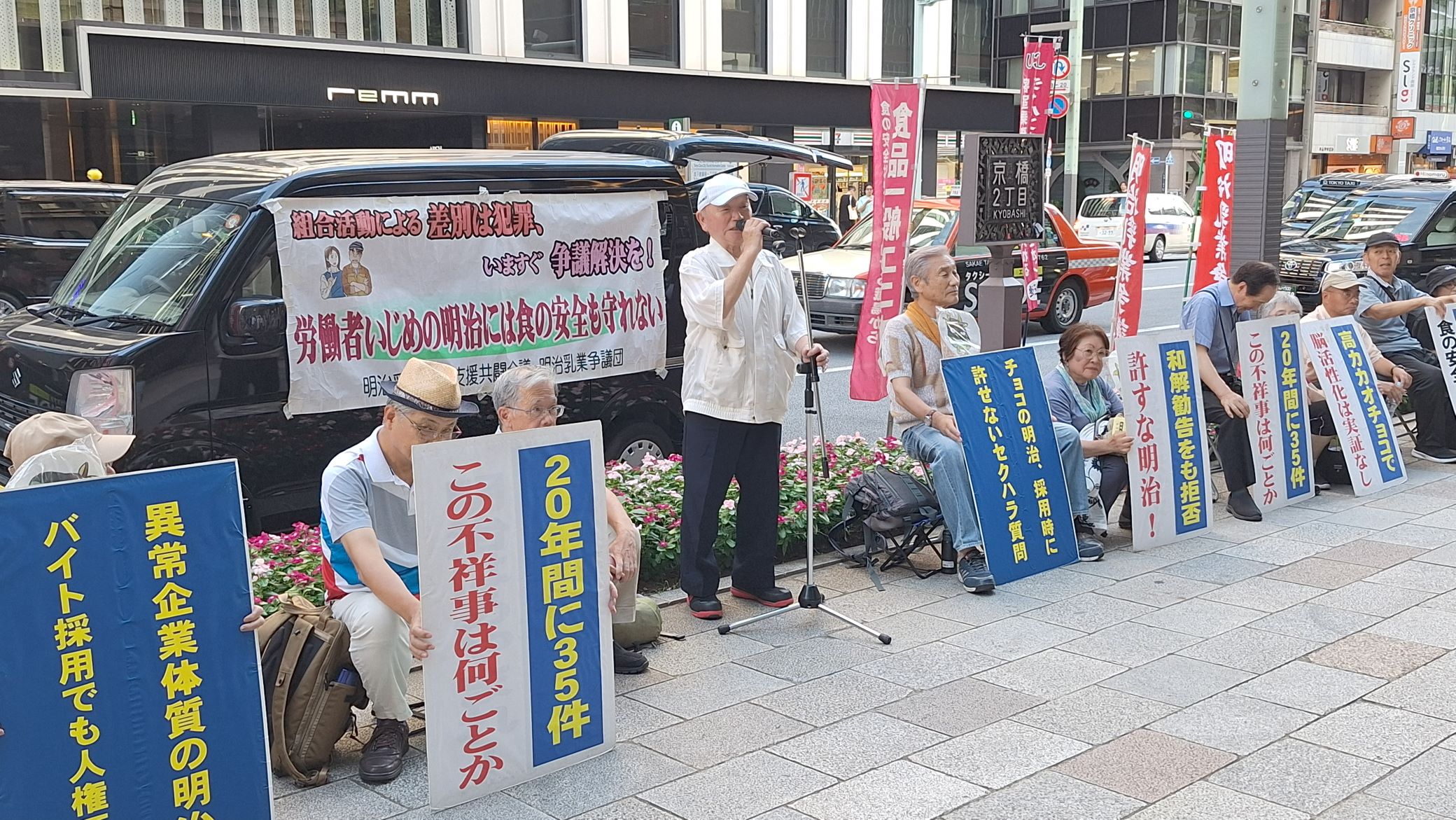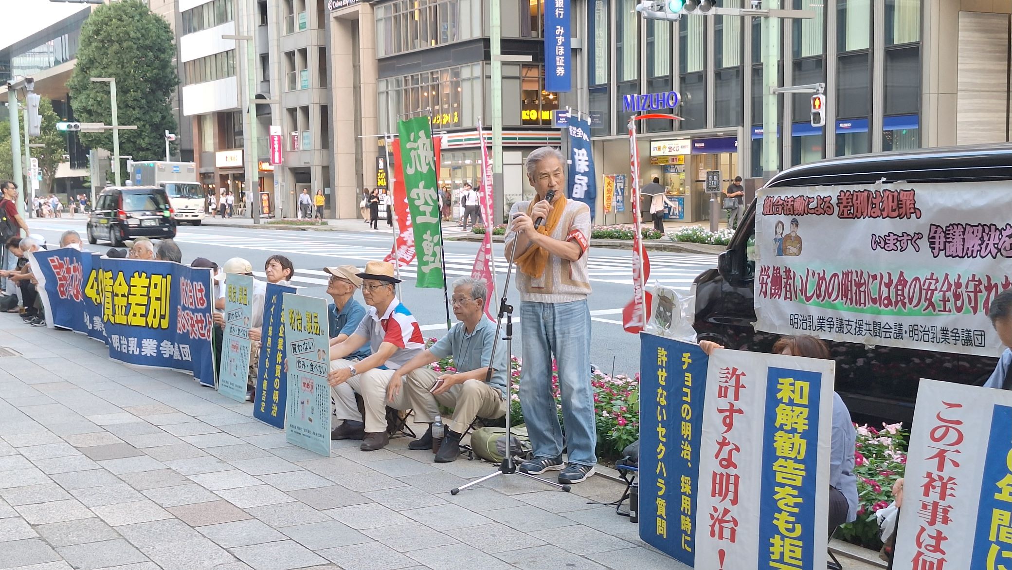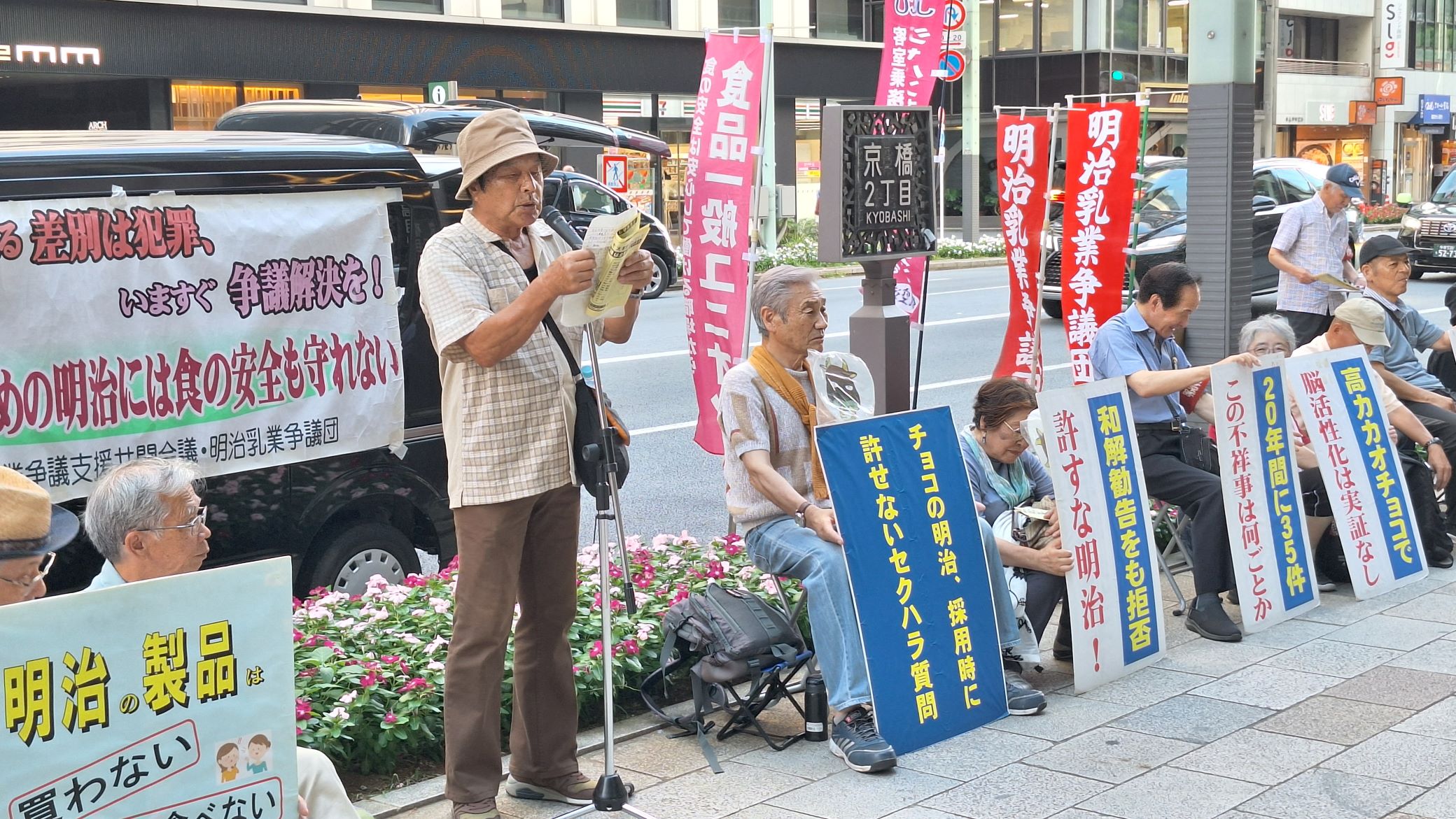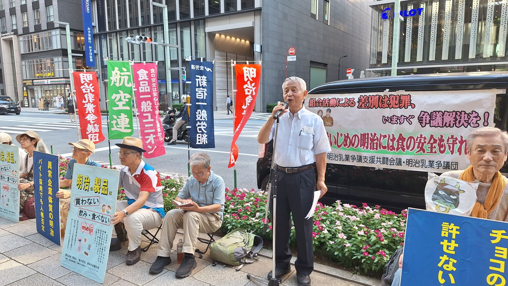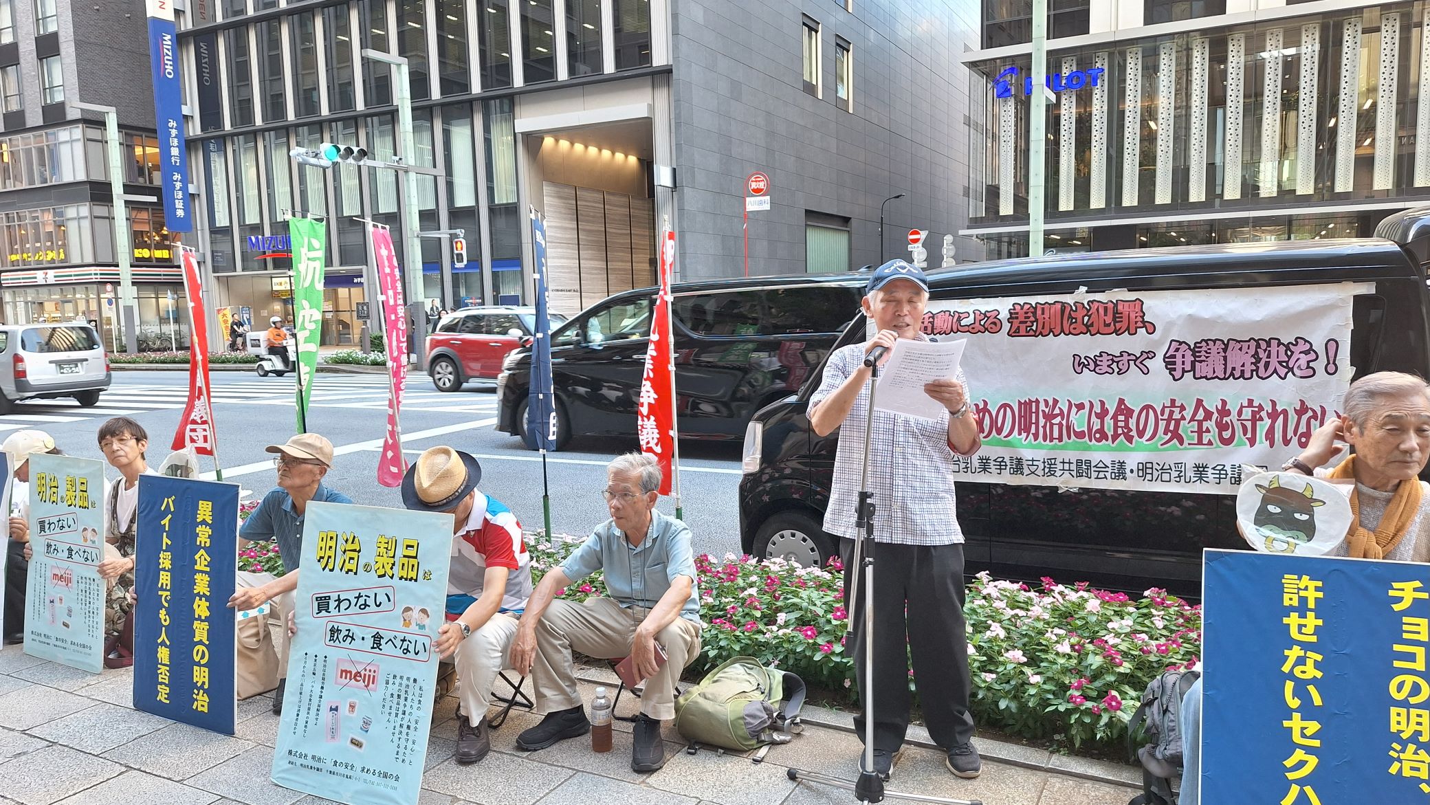 私たちは、貴社に「労働組合活動を理由とした昇給昇格差別」の是正を求めている、全国9事業所に在籍していた64人の争議団です。八尾社長ご自身への要請は初めてとなりますが、これまで(株)明治及び明治HDの社長及び経歴された方のご自宅に毎月定例で訪問している行動です。