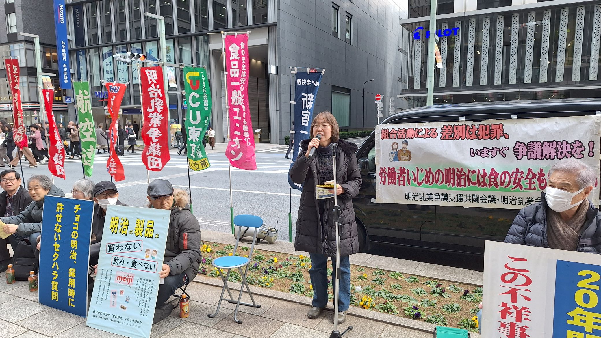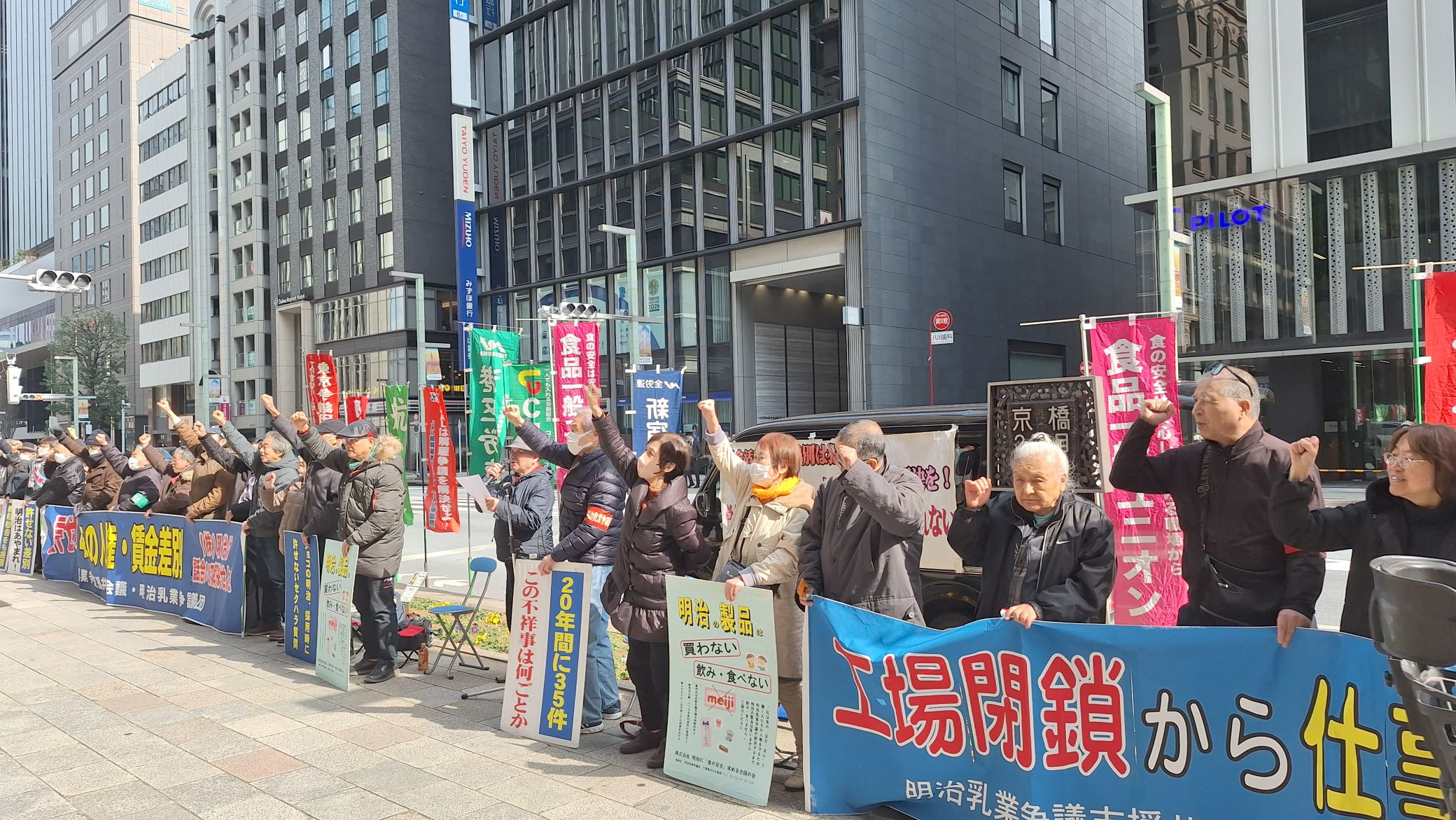 早期に解決への決断を株式会社明治・八尾文二郎社長と親会社明治HD・松田克也社長へ向けた第110次座り込み行動を、京橋エドグラン前で2月16日に実施しました。